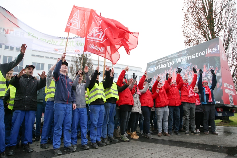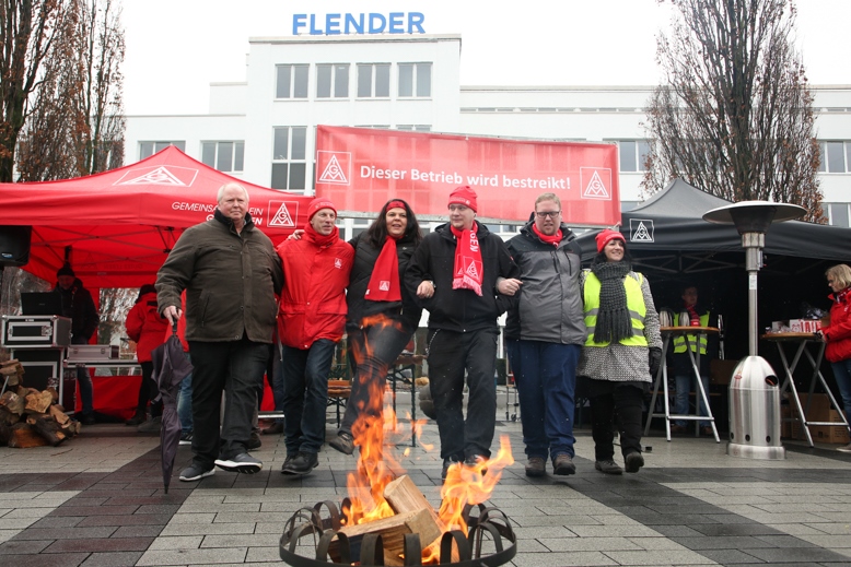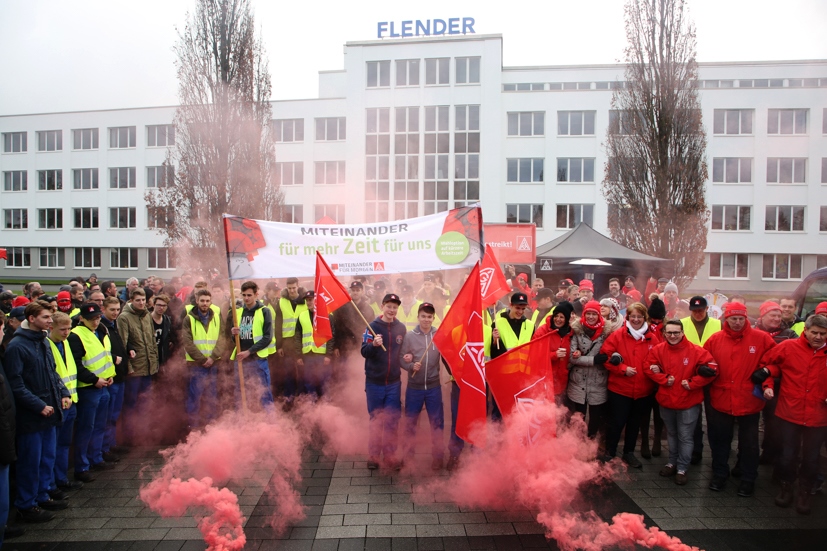 Nachdem die Verhandlungen zwischen IG Metall und den Arbeitgeberverbänden abgebrochen waren, hat die IG Metall NRW 72 Betriebe zu einem 24–Stunden–Warnstreik aufgerufen. 1050 Beschäftigte der Flender GmbH waren von dieser neuen Form des Warnstreiks im Bocholter Werk betroffen. Vom 02.02.2018 6 Uhr bis einschließlich 03.02.2018 6 Uhr stand der Betrieb.