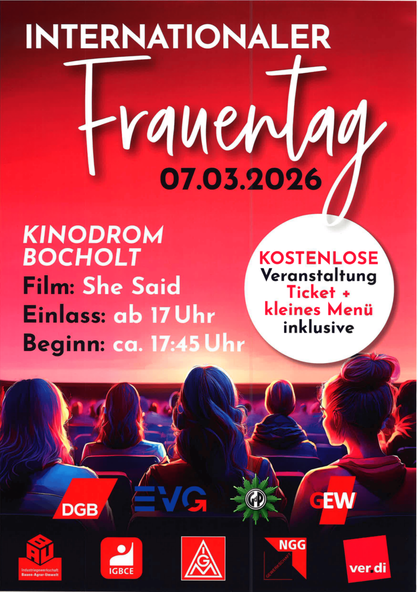 Zum Internationalen Frauentag 2026 werden die DGB – Gewerkschaften wieder einen Stand in der Bocholter Innenstadt haben. Ihr findet uns bereits am Samstag, 07. März 2026 in der Zeit von ca. 10.00 Uhr bis 12.00 Uhr vor dem Gebäude der Stadtsparkasse Bocholt (Nähe Cafe Extrablatt).