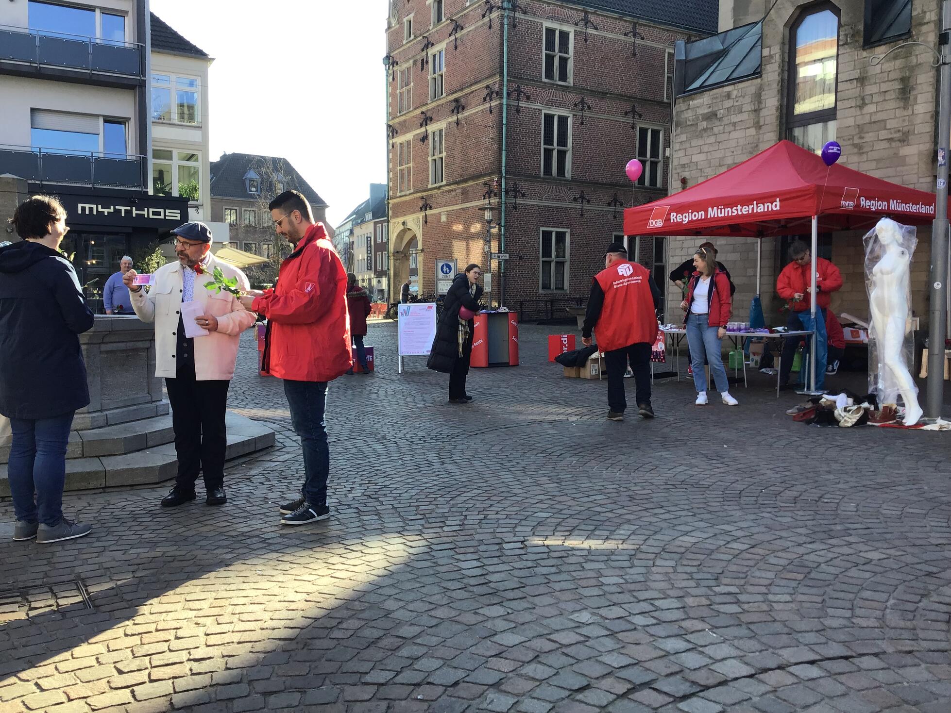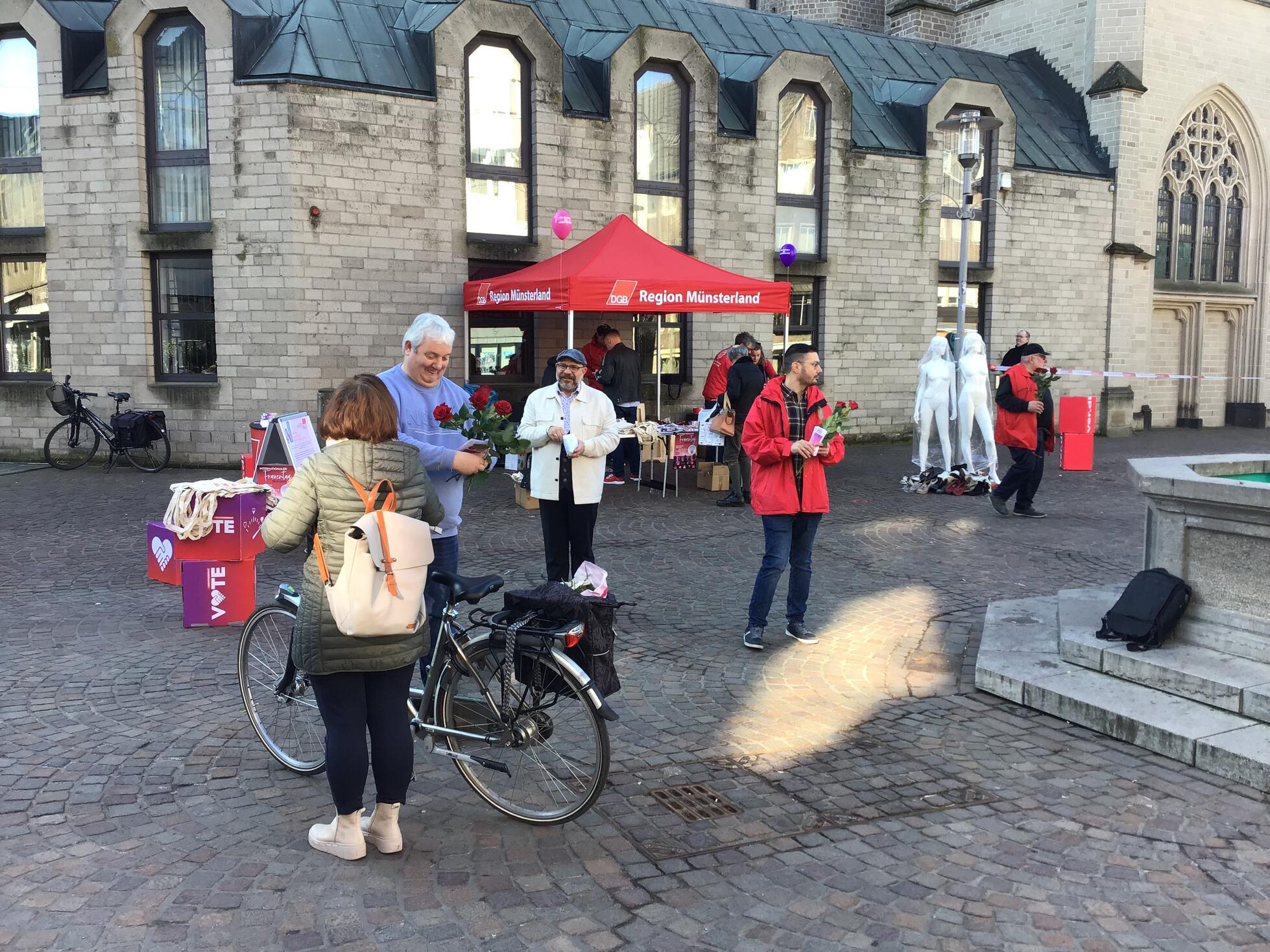 Zum ersten Mal seit vielen Jahren haben sich die DGB Gewerkschaften des Kreises Borken 2025 zusammengetan, um den internationalen Frauentag in der Öffentlichkeit zu feiern. So wurden am Samstagmorgen auf dem St. Georg – Platz in Bocholt mehr als 300 Rosen an Frauen verteilt, verbunden mit einem Danke für ihre großartige gesellschaftliche Arbeit.