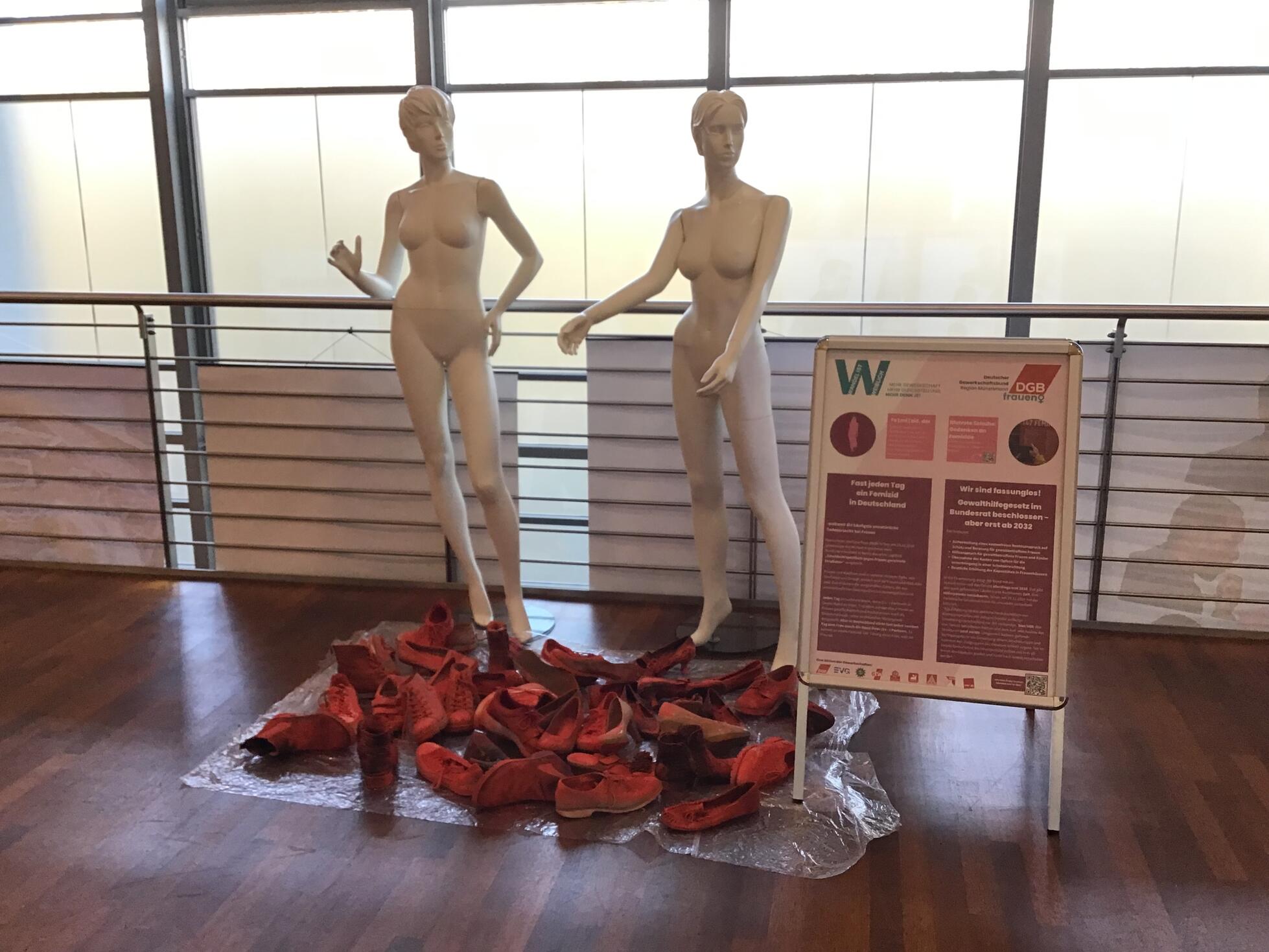 Da der Frauentag in diesem Jahr auf das Thema „Fast jeden Tag ein Femizid in Deutschland“ aufmerksam machen wollte, wurden blutrote Schuhe und Schaufensterpuppen sowohl in der Innenstadt als auch im Kino in Gedenken an die Femizide ausgestellt.