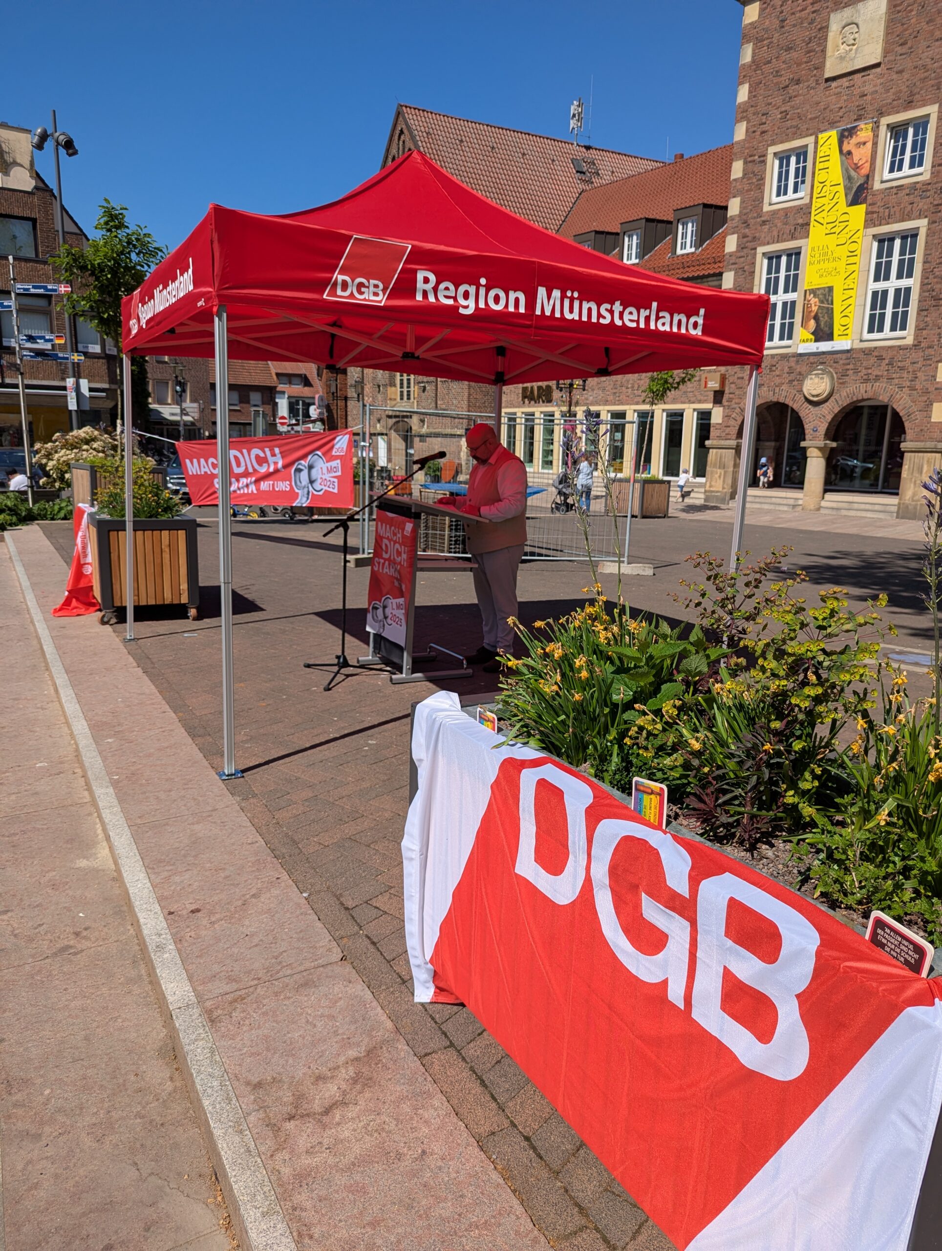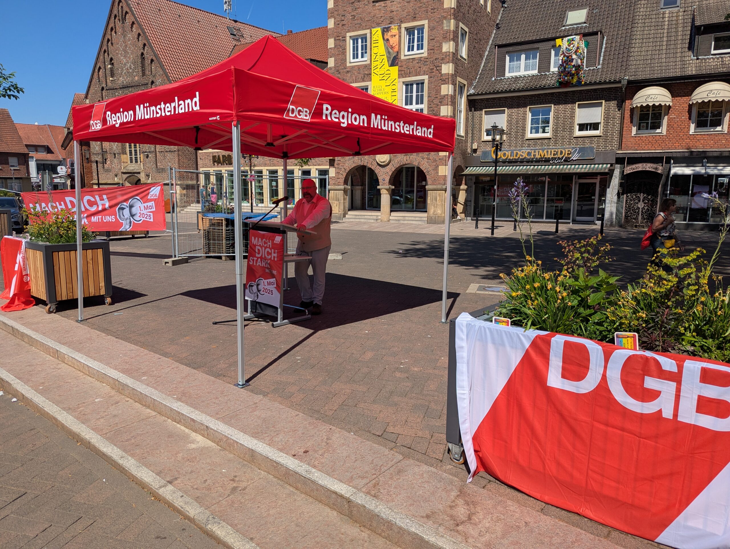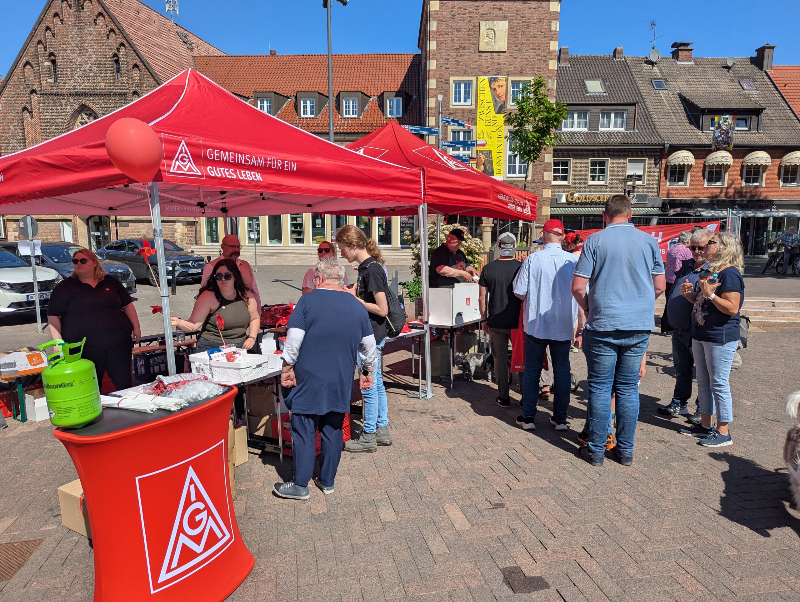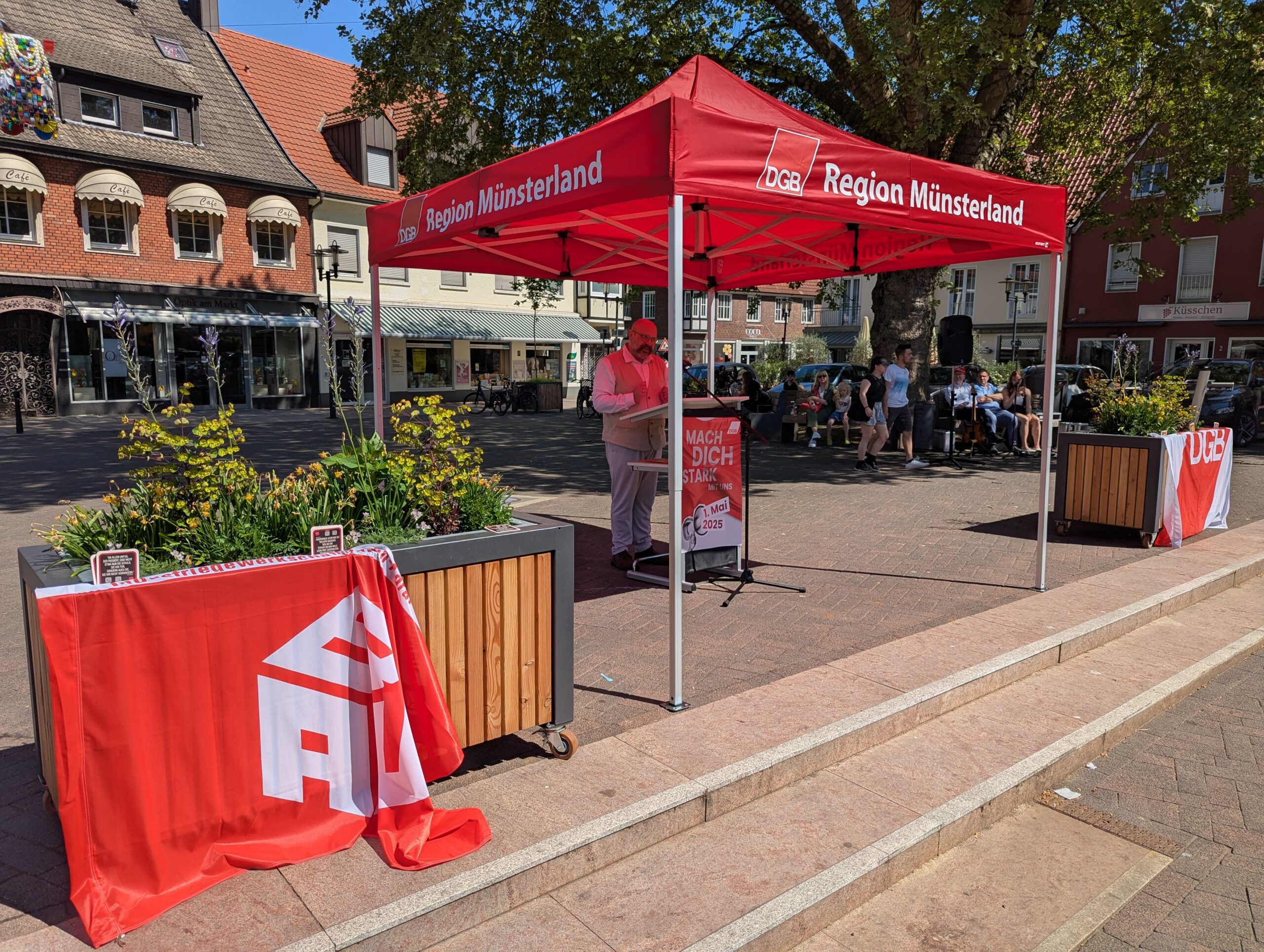 Die neue Bundesregierung steht kurz vor dem Start. Der 1. Mai zeigt, welche Erwartungen Beschäftigte und Gewerkschaften jetzt an die Politik haben. Unter dem Motto „Mach dich stark mit uns!“ versammelten sich zum Tag der Arbeit Zigtausende in zahlreichen Städten. Auch in Bocholt zeigten Gewerkschafterinnen und Gewerkschafter Flagge für ihre Forderungen zum Tag der Arbeit.